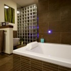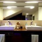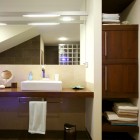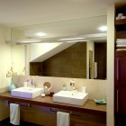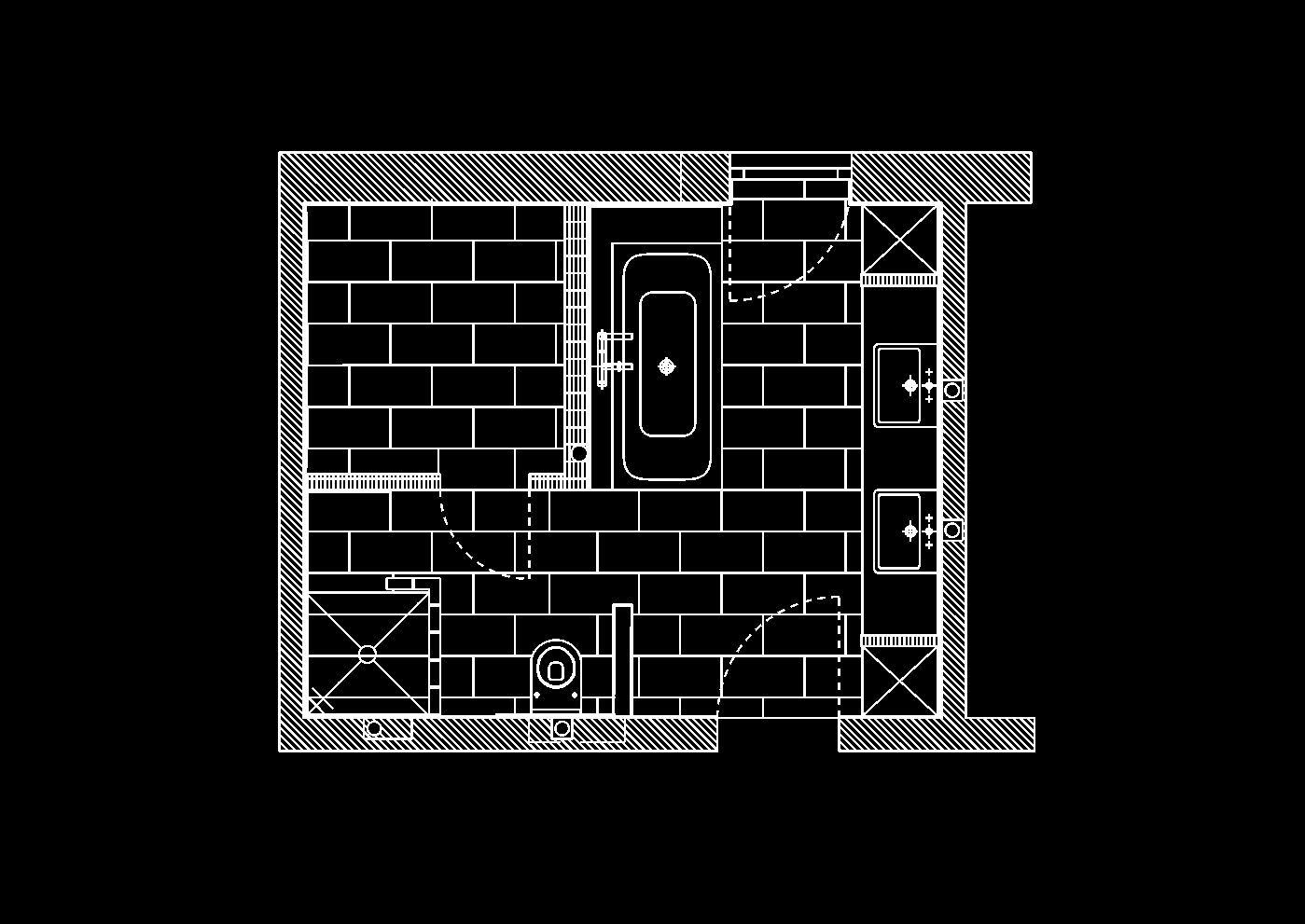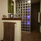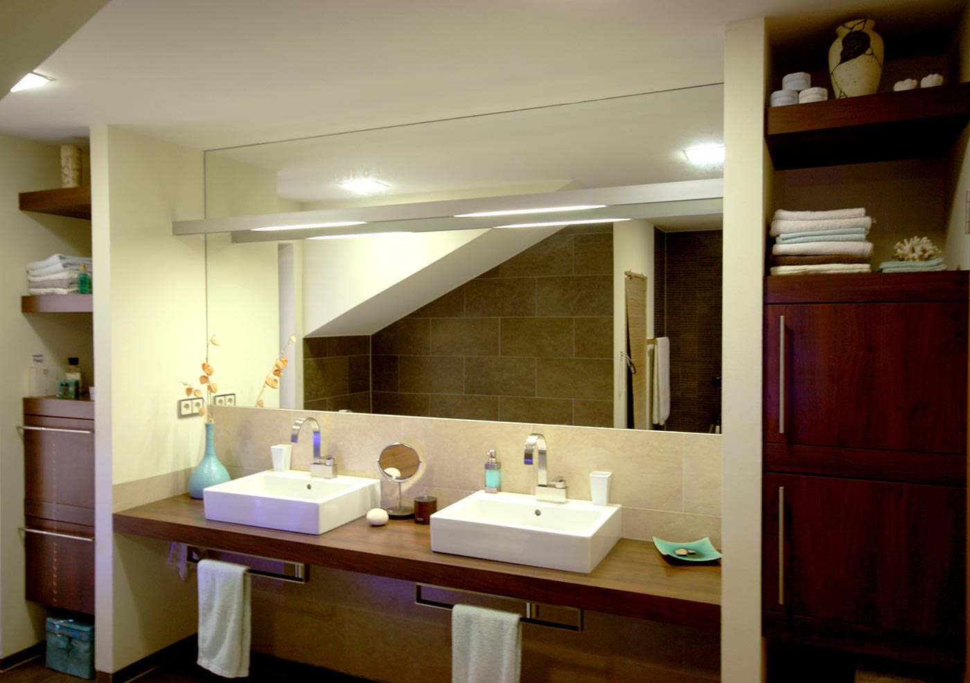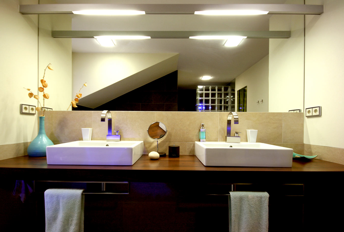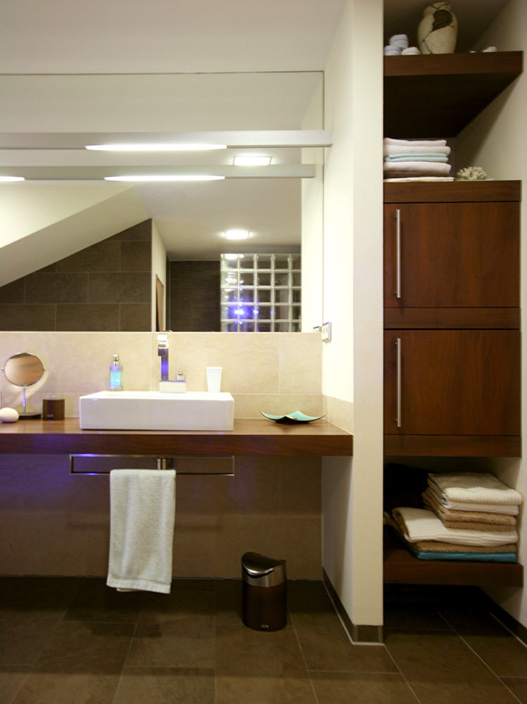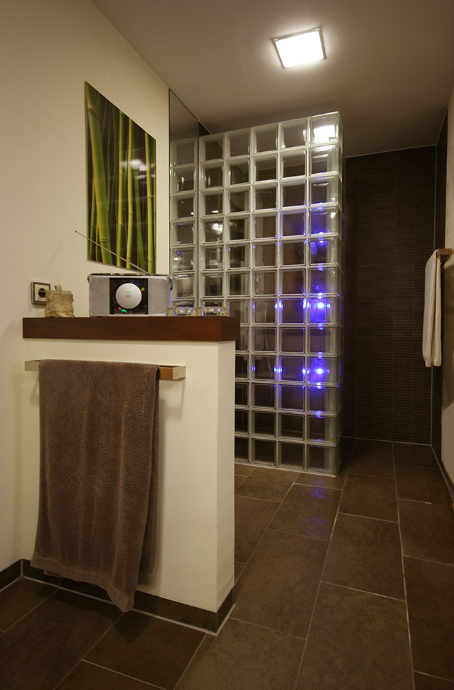 Durch den L-förmigen Grundriss, die Glasbausteinewand und die halbhohe Abtrennung zum WC entstehen kleinere, gemütliche Bereiche. Der große, symmetrisch angeordnete Waschtisch, bietet mit seinen hochwertigen Einbaumöbeln viel Platz für Ordnung und unterstreicht hierdurch die Harmonie des Raumes. Die ausgewählten Materialien und die besondere Lichtstimmung verleihen dem Bad seine beruhigende Atmosphäre.