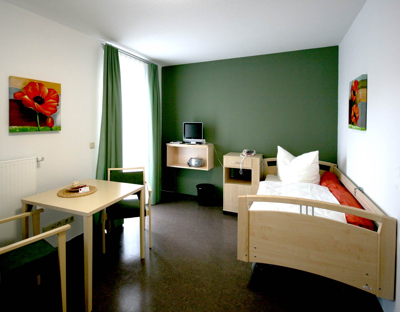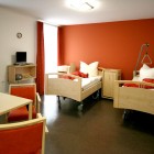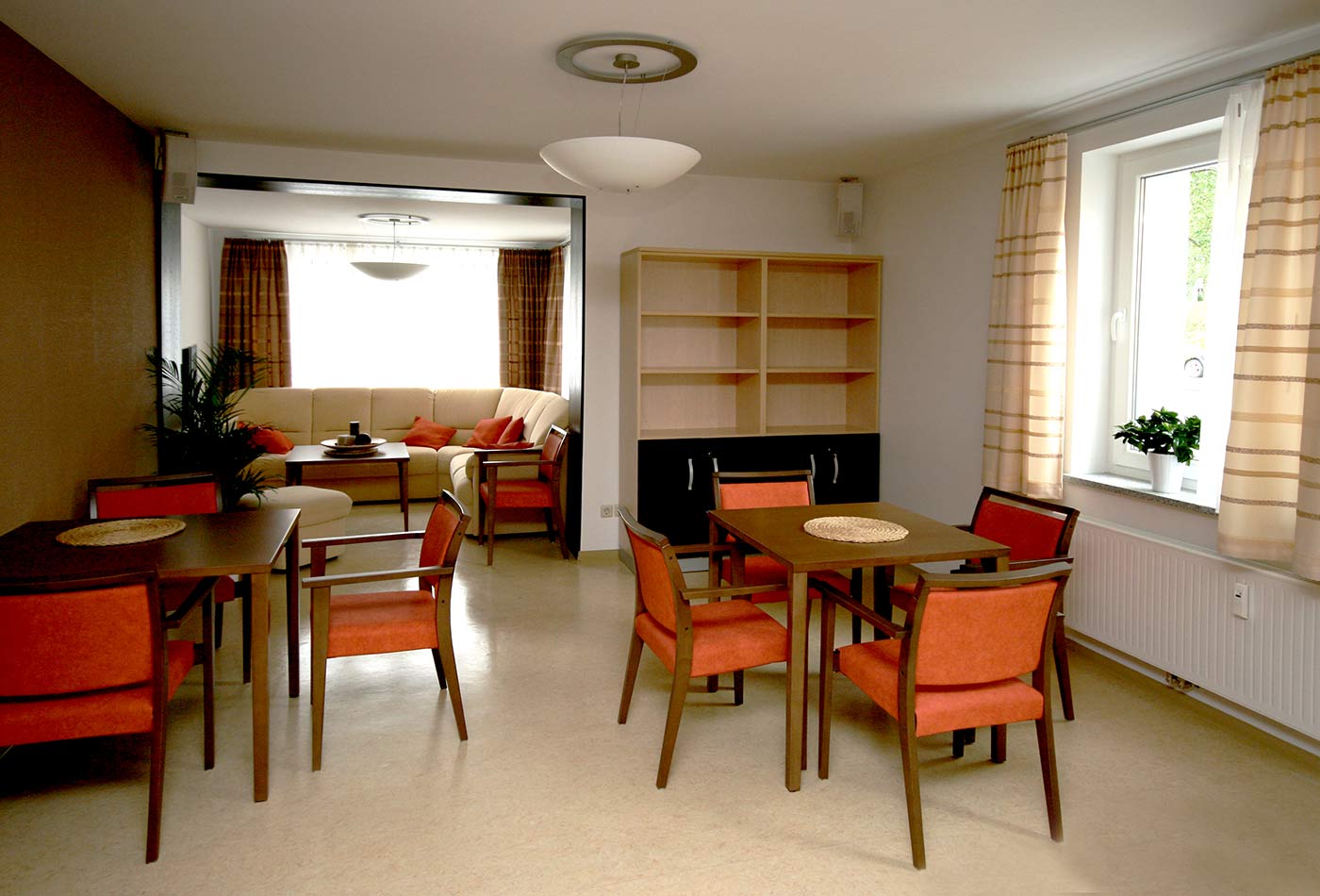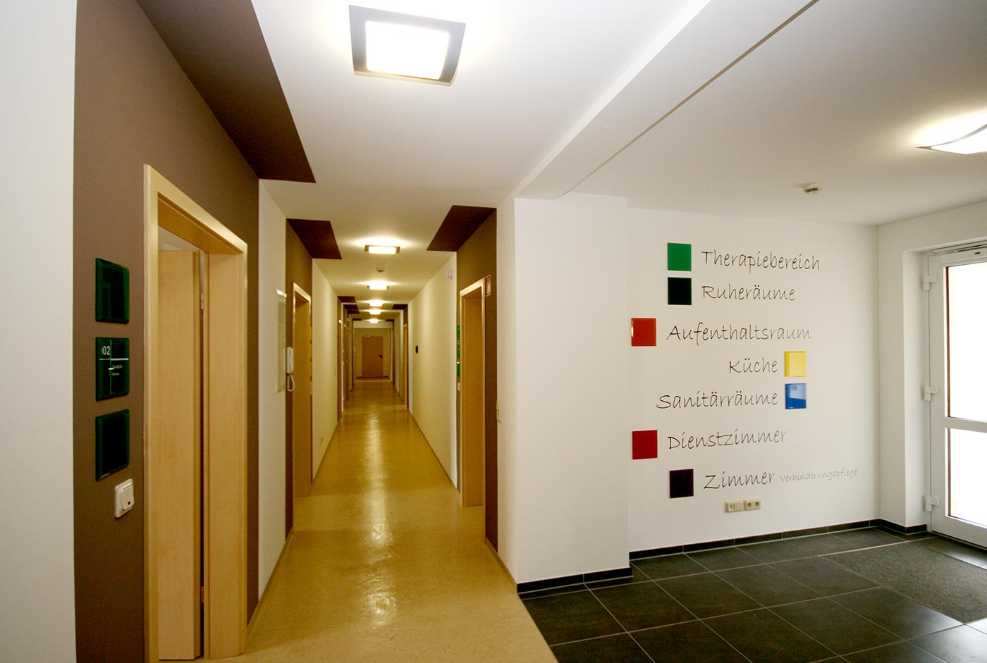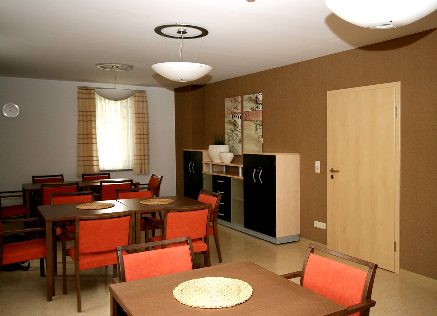 Im Haus sind ein Gemeinschaftsraum, ein Snoezelzimmer, eine behindertengerechte Kueche, Bueros, Sanitärräume und vier Pflegezimmer untergebracht.