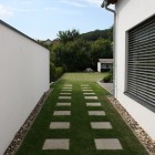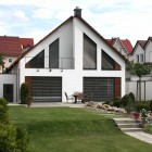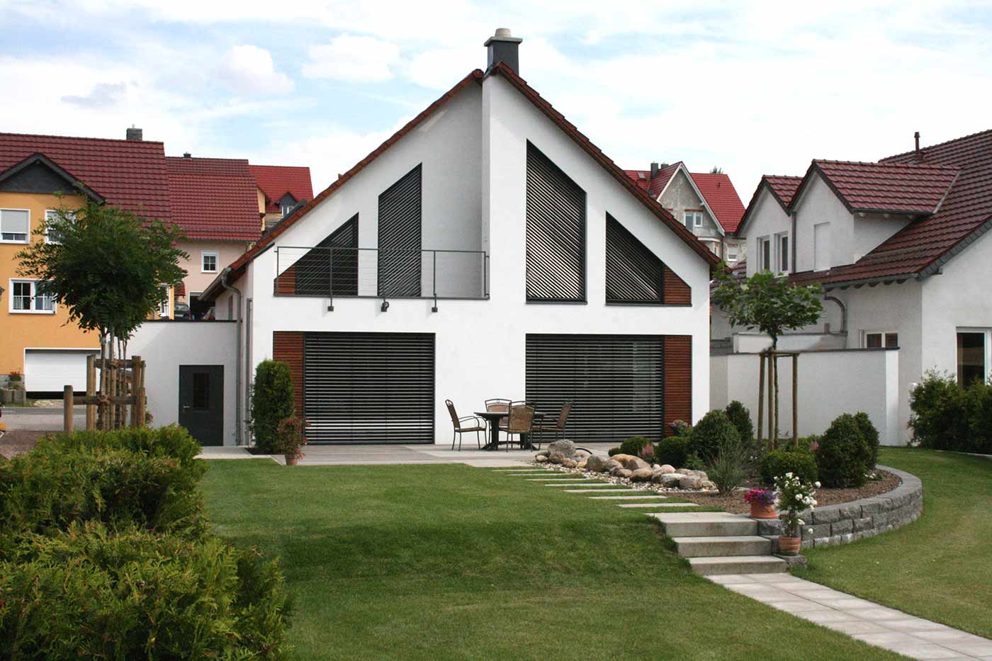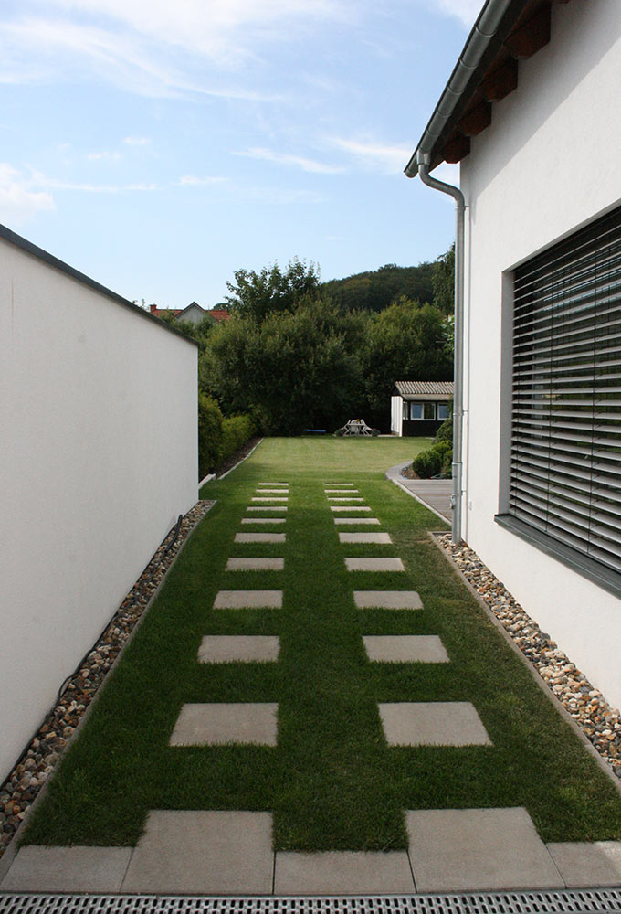 Schmal und langgestreckt liegt das Grundstück im erschlossenen Wohngebiet, dennoch gut ausgerichtet für die Ansprüche der Bauherrenfamilie an Ihr neues zu Hause. Dieser Situation Rechnung tragend, sind die Wohnräume mit ihren großen Fensterflächen nach Westen zum tiefen Garten angeordnet. Nebenräume mit kleineren Öffnungen befinden sich seitlich zu den angrenzenden Nachbargebäuden.