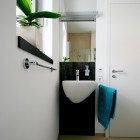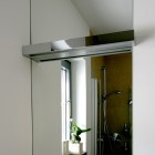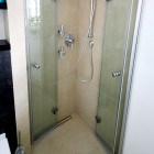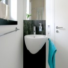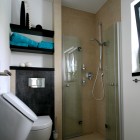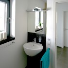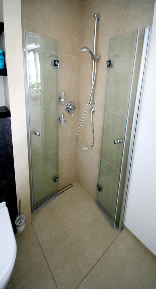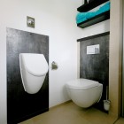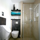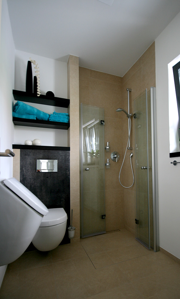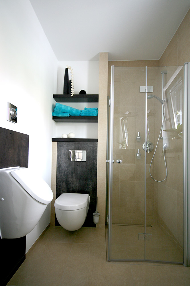 Ausgestattet mit Waschtisch, WC, Urinal und Dusche ist hier auf kleiner Fläche ein vollwertiges Bad entstanden. Sind die Glastüren der bodengleichen Dusche an die Wand geklappt, bleibt ein großzüges Gäste-WC.
