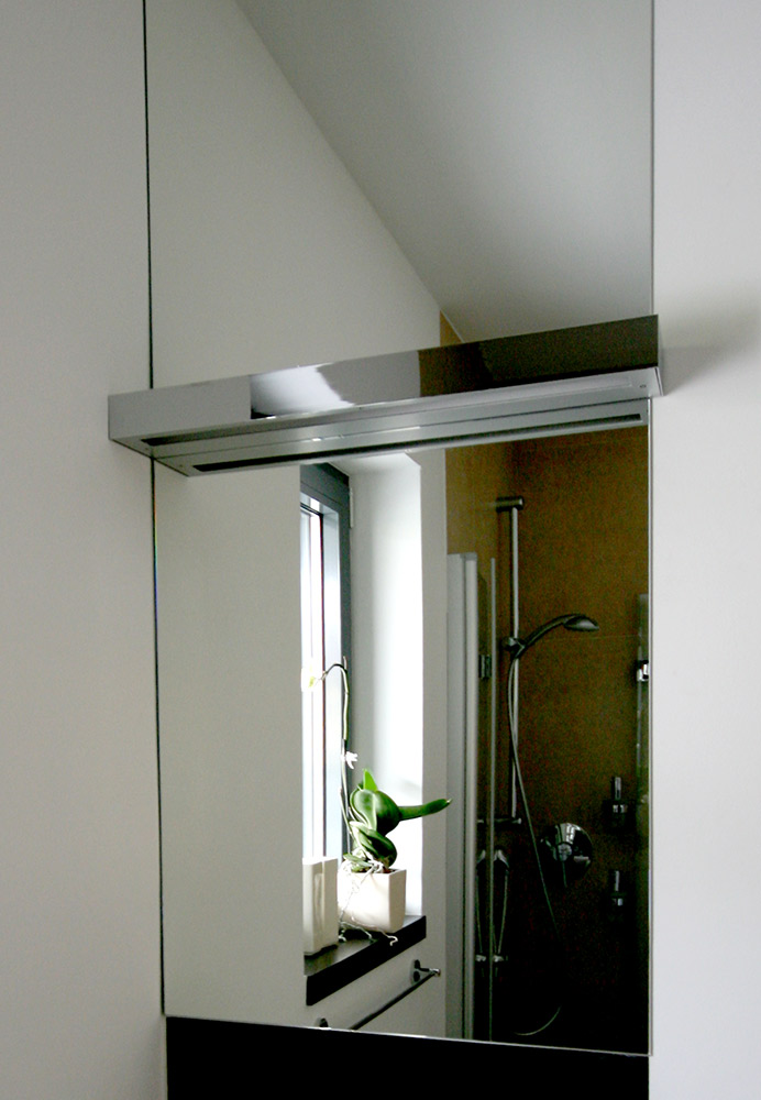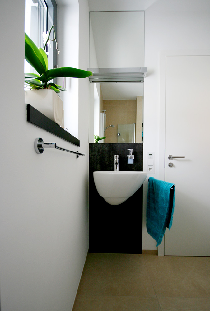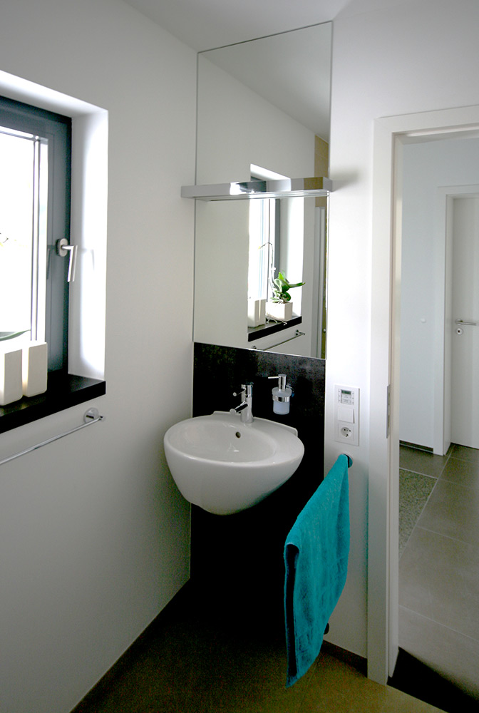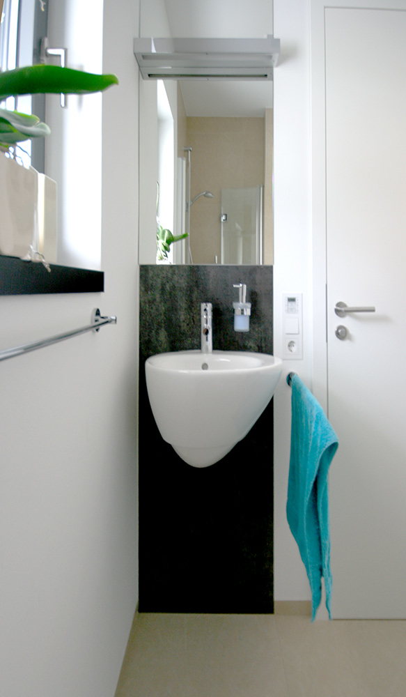 Durch das Fenster wird der Raum hell und freundlich und ist gut zu lüften. Die sparsam eingebauten großformatigen Fliesen setzen kontrastreiche Akzente.