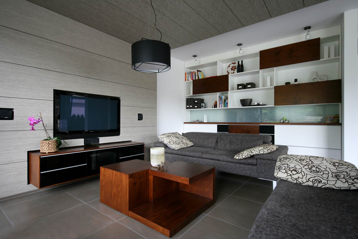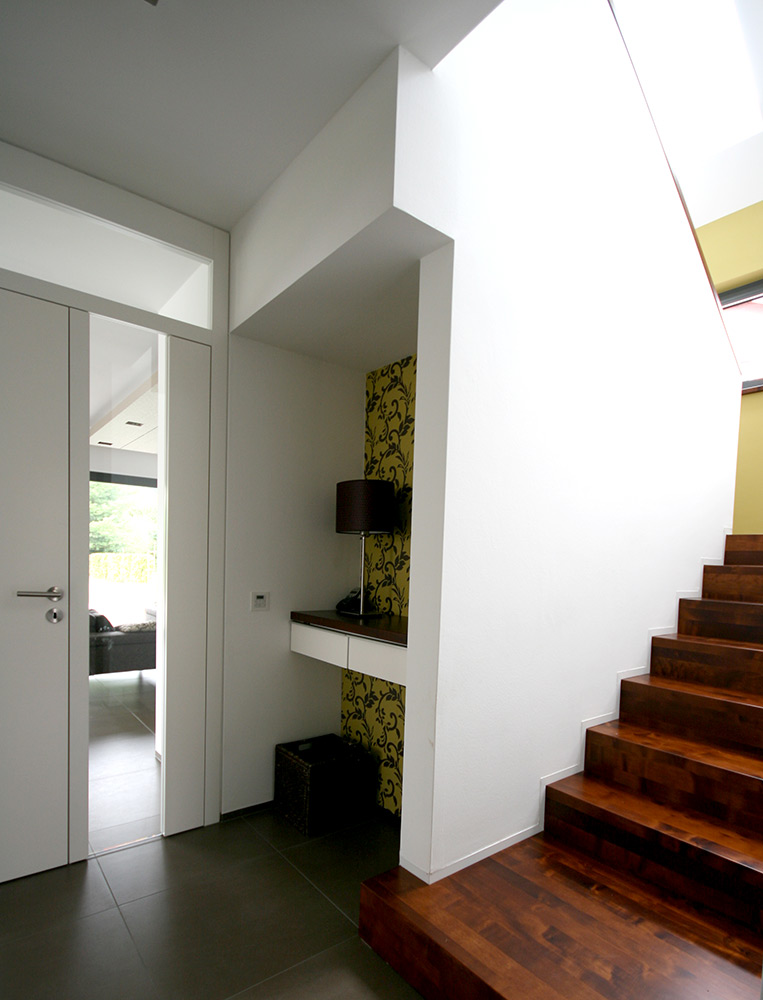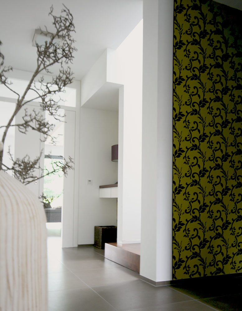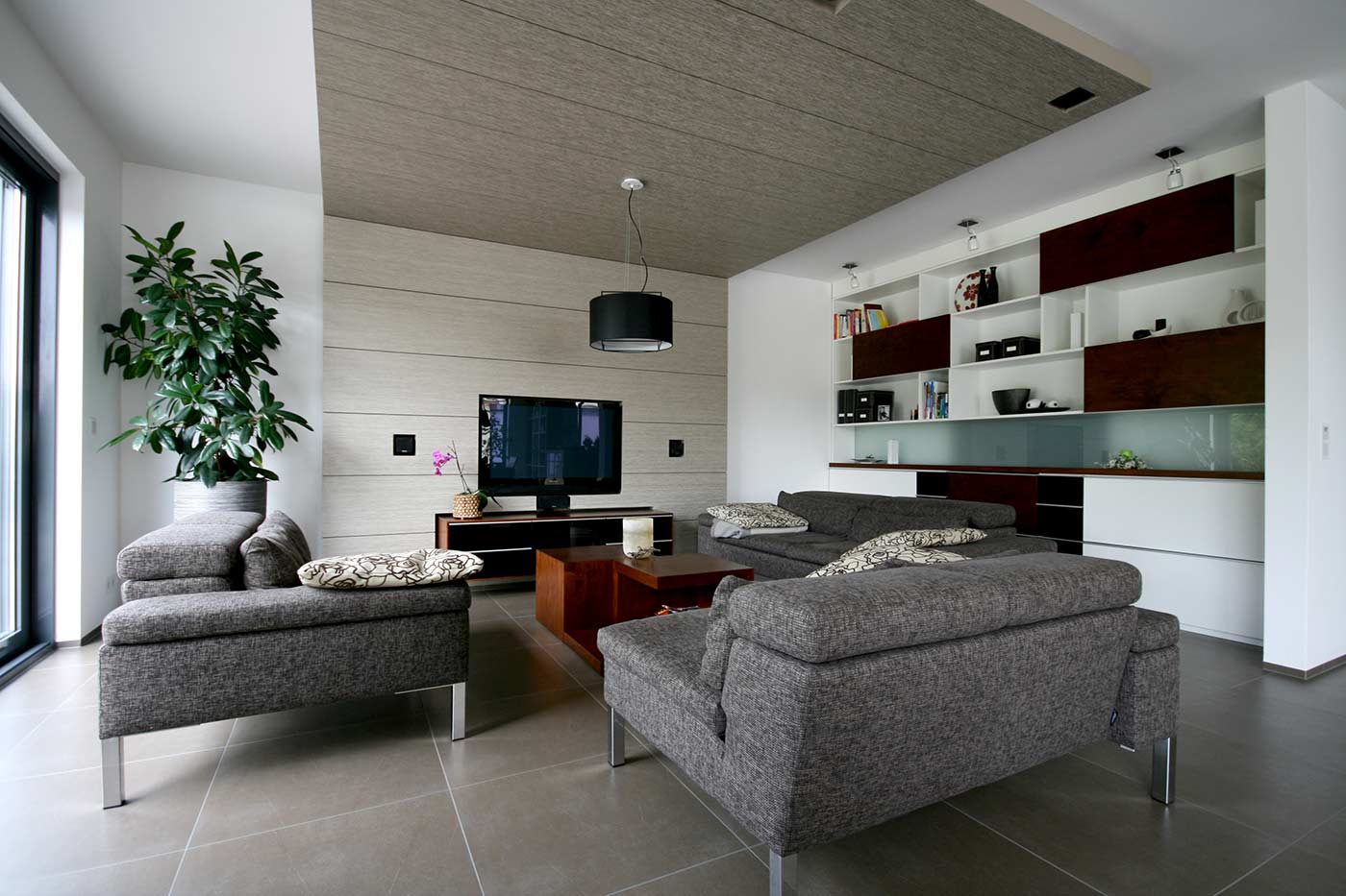 Strukturiert und funktional angeordnete Räume mit großen Fenstern, weißen Wänden und Türen sind geschmückt mit besonderen Elementen, wie dem Wand-Decken-Element für den Fernsehbereich, Einbaumöbeln, dem Farbspiel natürlicher Oberflächen von Holz und Leder, extravagant gemusterten Tapeten an ausgesuchten Wänden und dekorativen Leuchten.