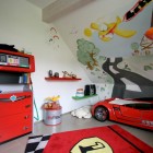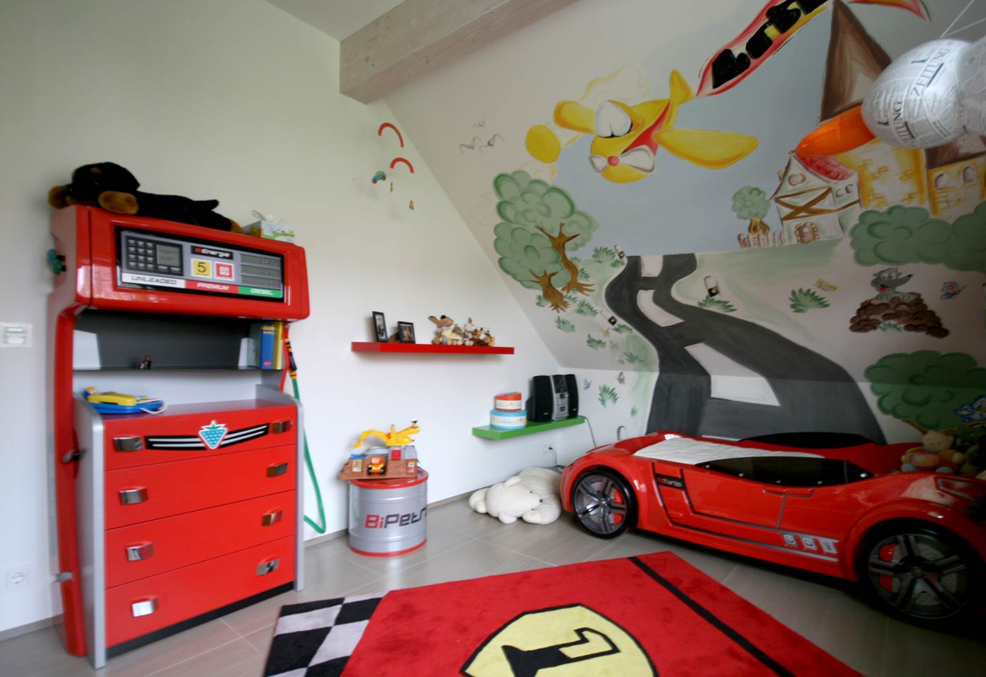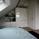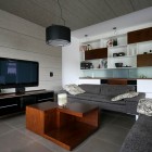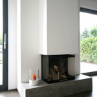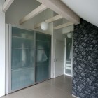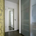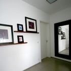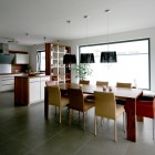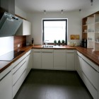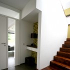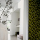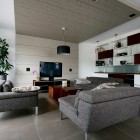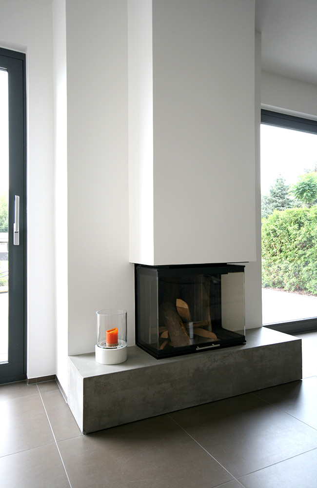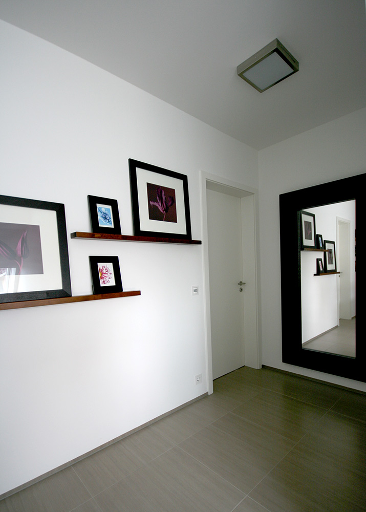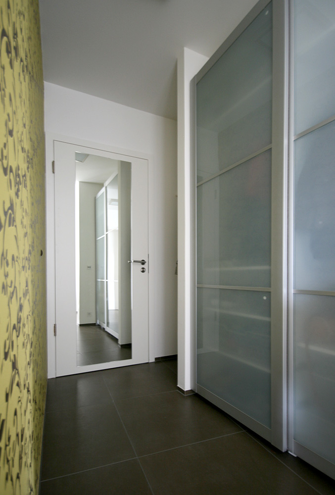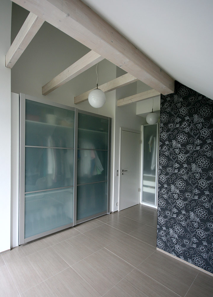 Strukturiert und funktional angeordnete Räume mit großen Fenstern, weißen Wänden und Türen sind geschmückt mit besonderen Elementen, wie dem Wand-Decken-Element für den Fernsehbereich, Einbaumöbeln, dem Farbspiel natürlicher Oberflächen von Holz und Leder, extravagant gemusterten Tapeten an ausgesuchten Wänden und dekorativen Leuchten.